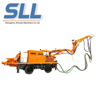 The shotcrete machine uses a pressure-transporting concrete mixture to directly project onto the rock surface through a nozzle to form a consolidated concrete protective layer.